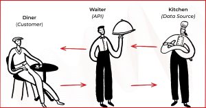 In this setting, the diner is the user who needs the data or service, and the kitchen is the data source or the system that processes your request. The API is the waiter, taking requests from a user and acquiring the required data or service from a data source, before delivering that data back to the user.